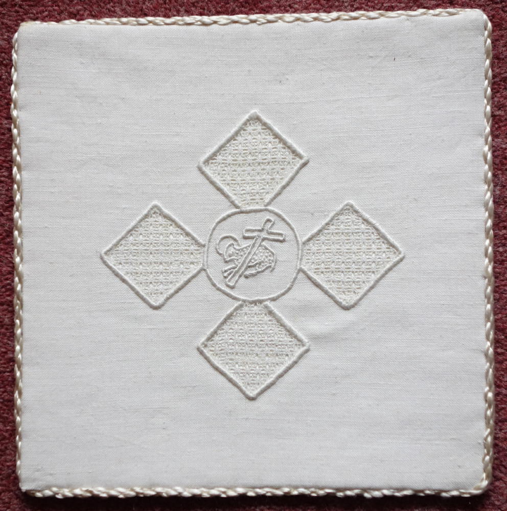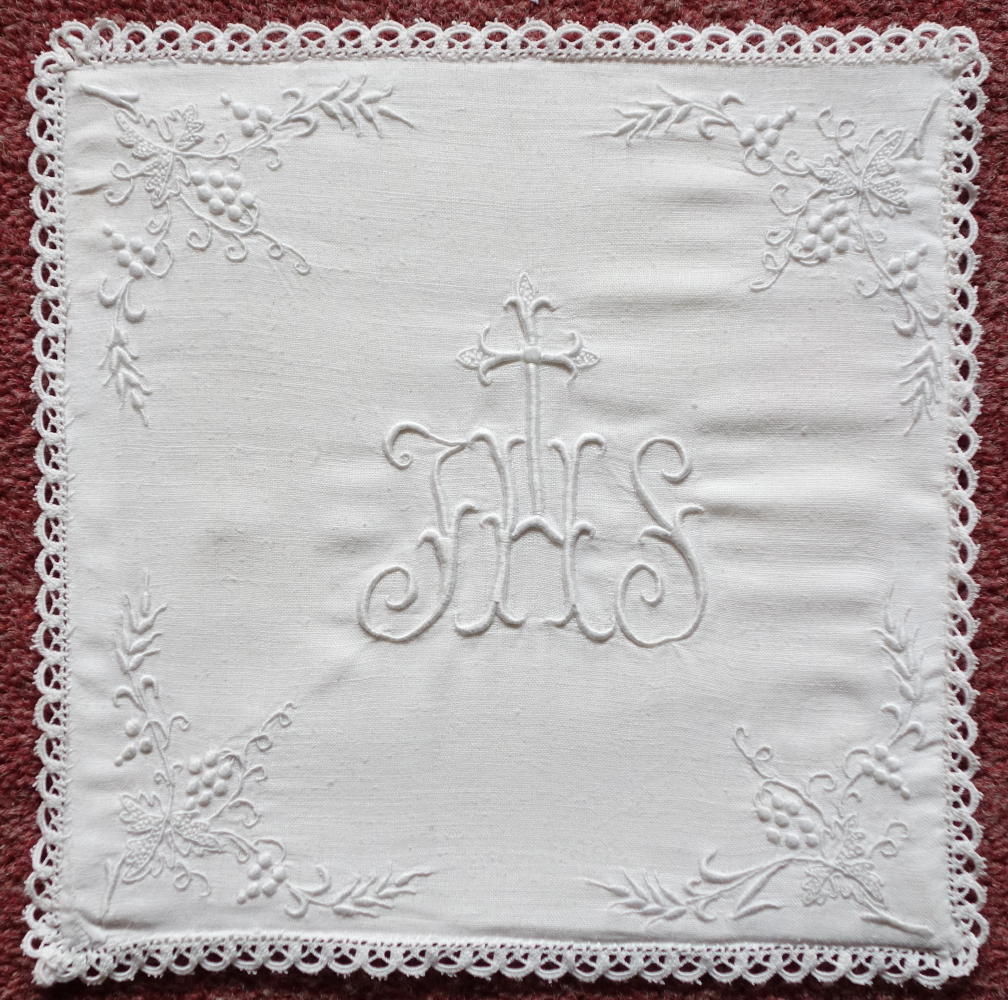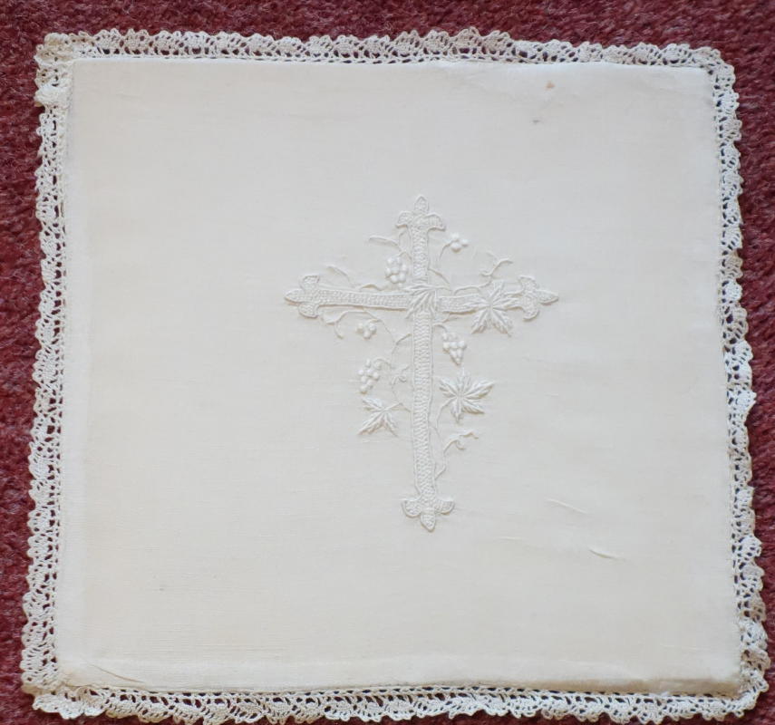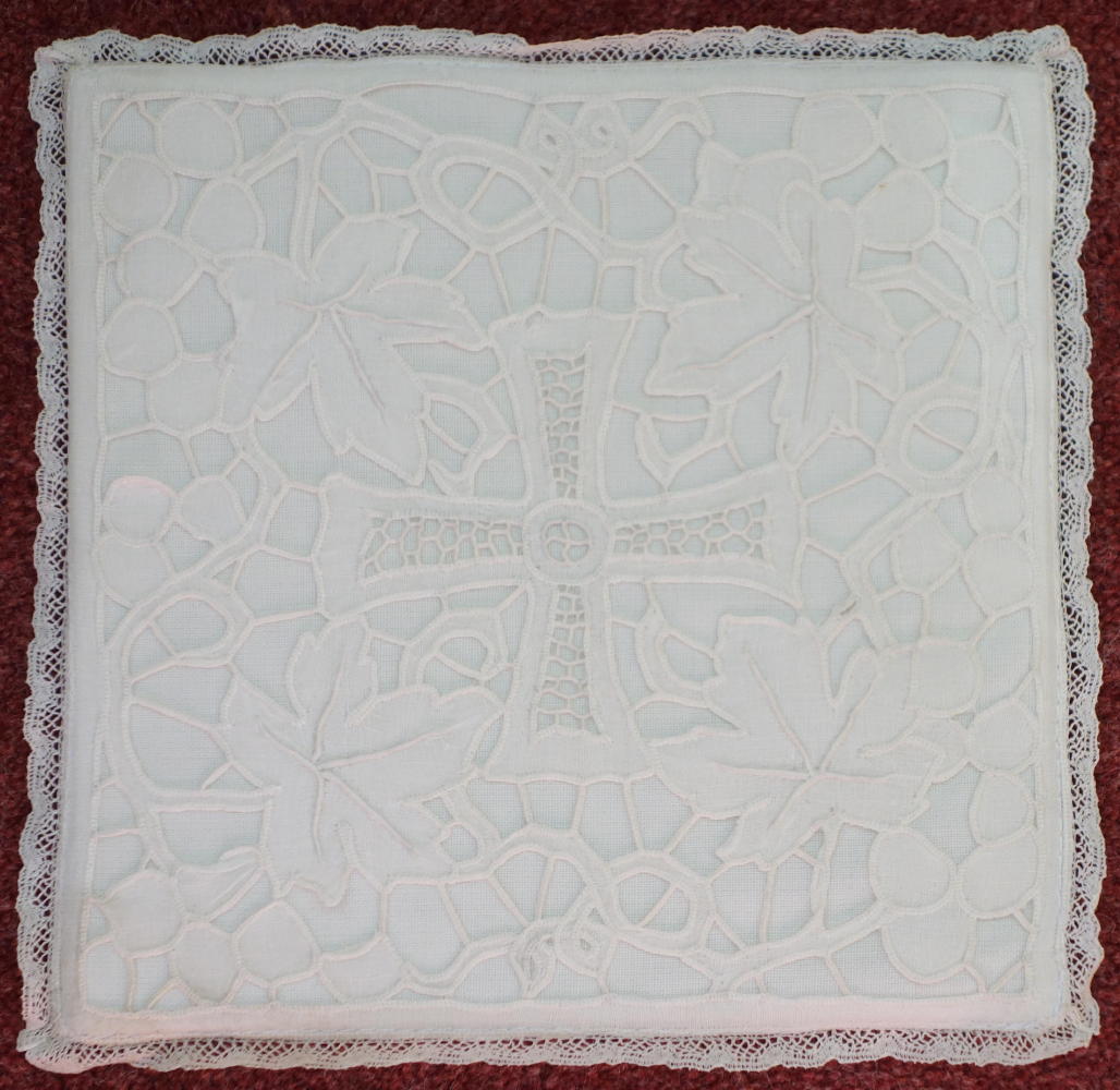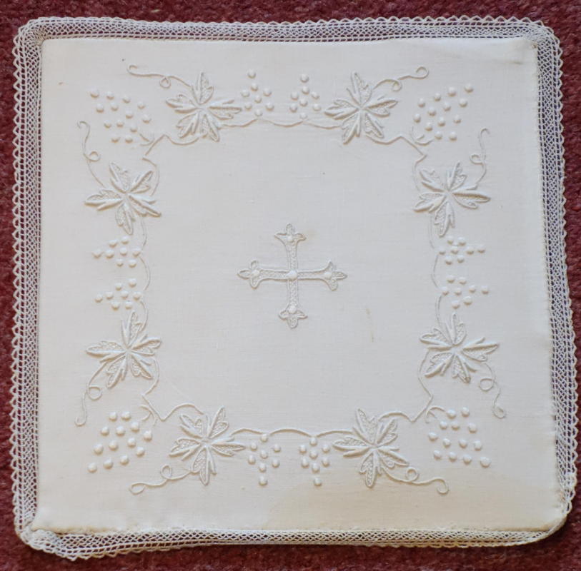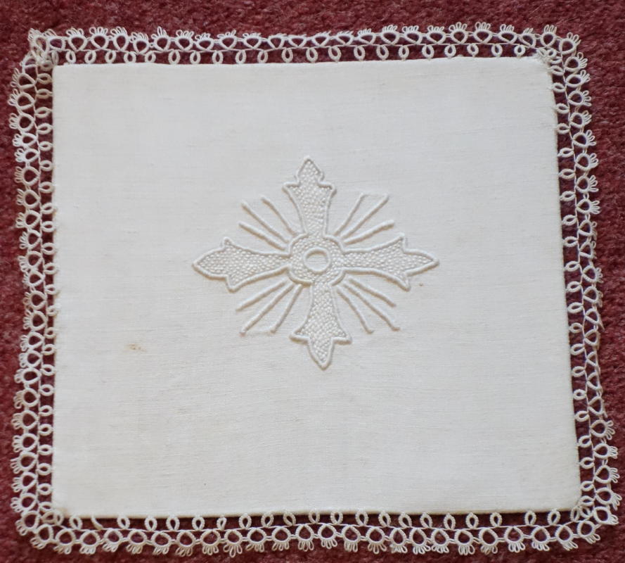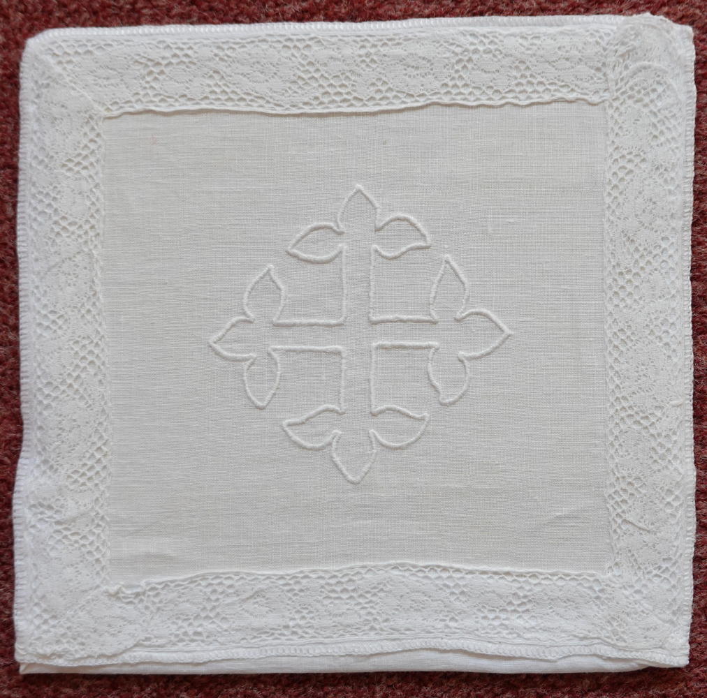 We usually have a variety of second-hand Altar Linens in stock. These currently include Purificators, Corporals, Lavabo Towels, Palls, both plain and with embroidery or lace. Below are items from our current stock, but our stock does change all the time, so please contact us for up to date details of availability.