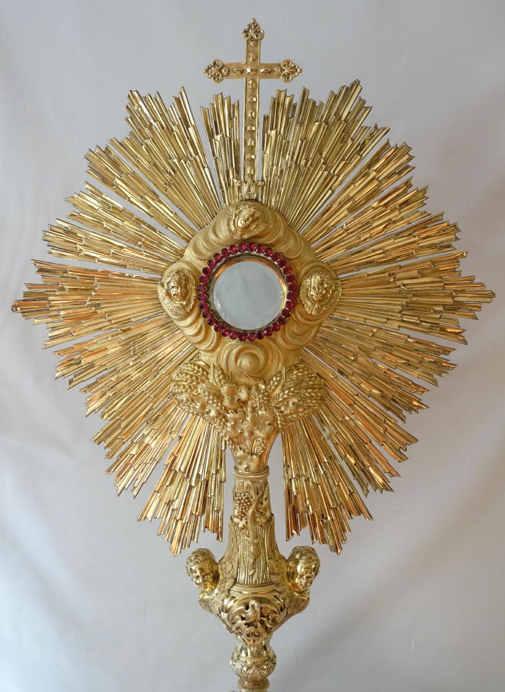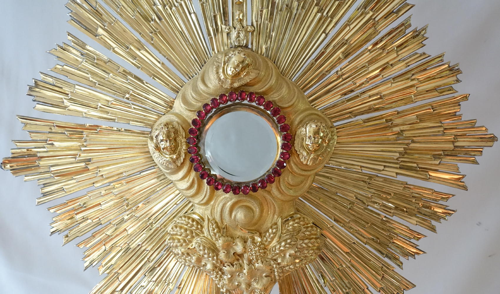 The Monstrance comes complete with solid silver Lunette, fully enclosed with glass on both sides.