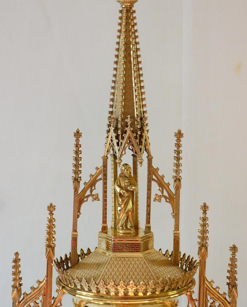 The top of the Monstrance is surmounted with a Gothic style cross.
