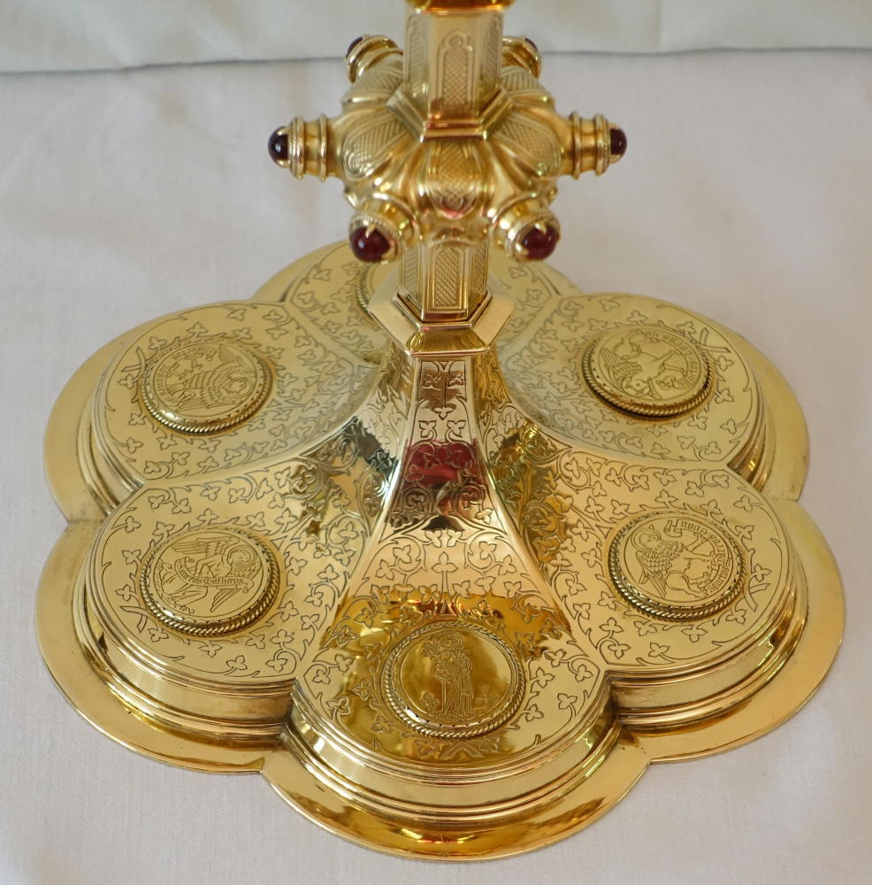 The hexagonal petalled base is engraved all over. On each petal is an engraved roundel, these depict The Crucifixion, St Joseph and the Four Evangelists.