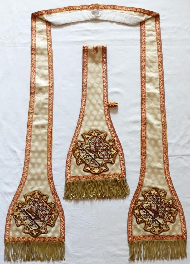 Complete with matching Stole, embroidered to the same designs, with gold bullion tassels at the centre.