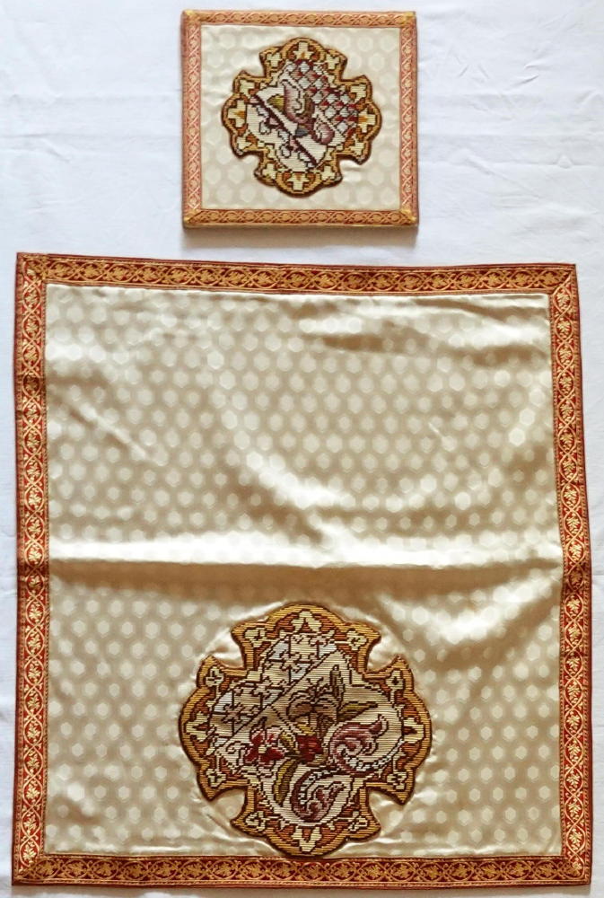 5 matching pieces, all with needlepoint to finish: Chasuble, Stole, Maniple, Chalice Veil & Burse.