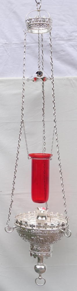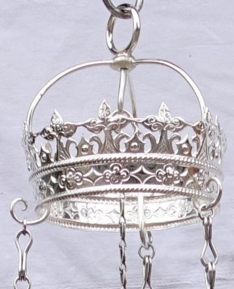 The lamp, including the lamp, chains and crown are all made in sterling silver. The piece is highly decorative throughout.