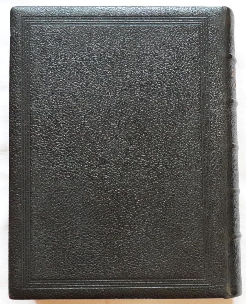 Leather bound with decorative cross to front & back. Gilt edged pages.