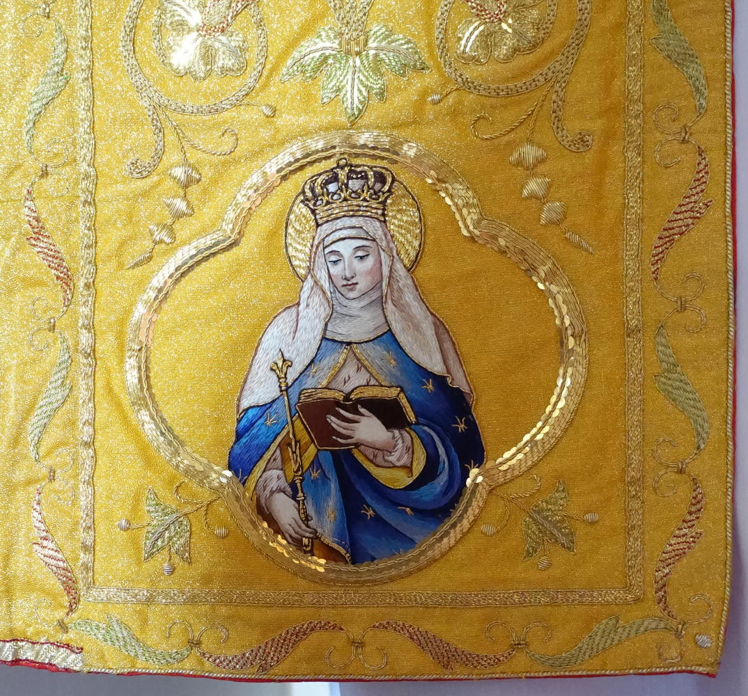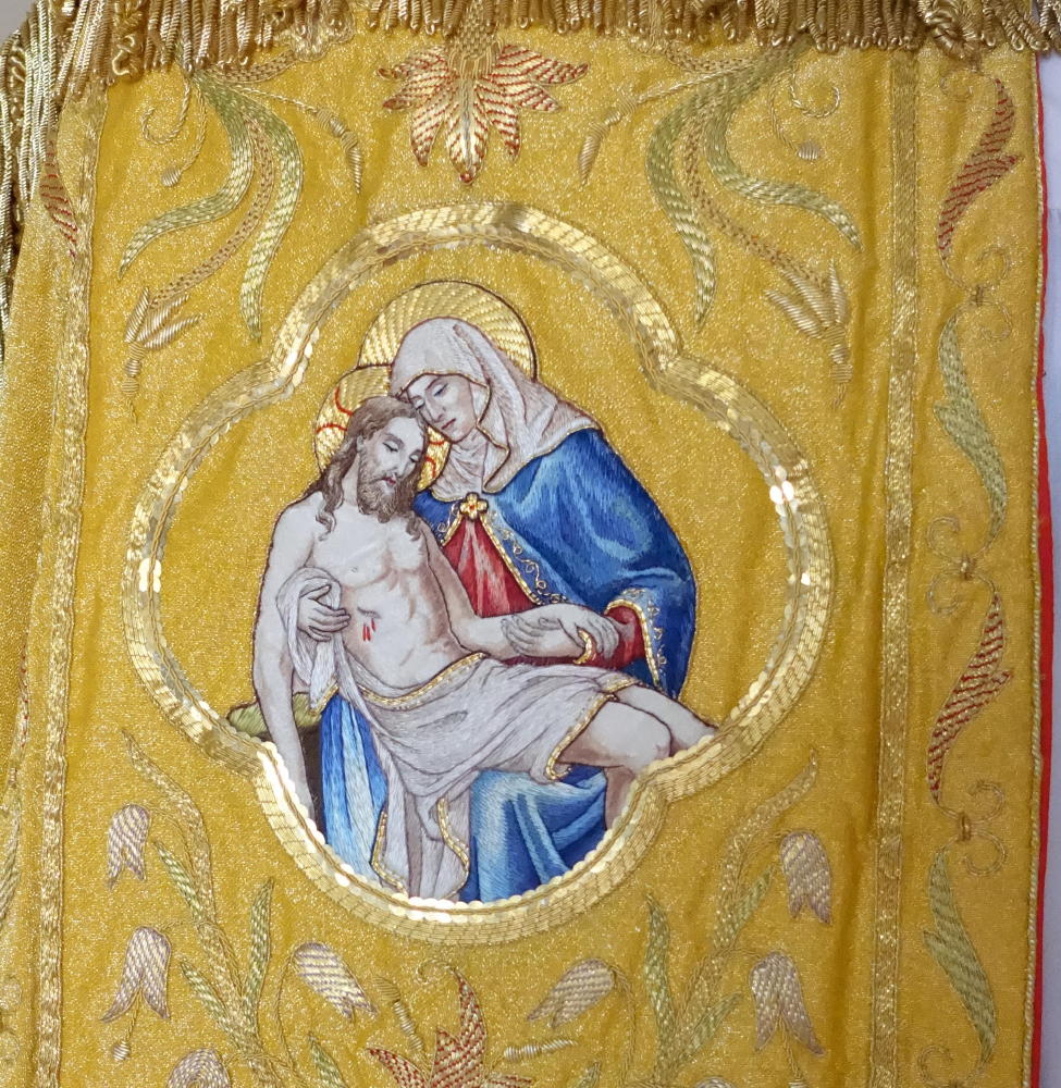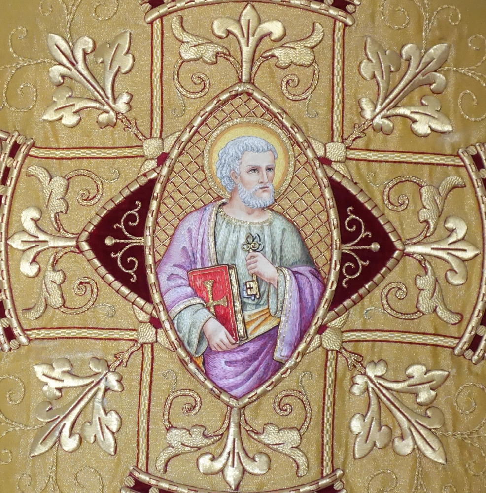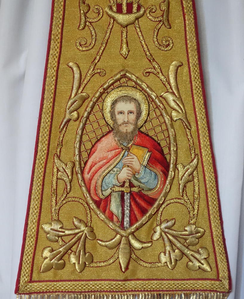Dedicated to St Peter & St Paul, the Cope and Stole have rich gold bullion embroidery, finished with coloured silk embroidered pictures of St Peter & St Paul.