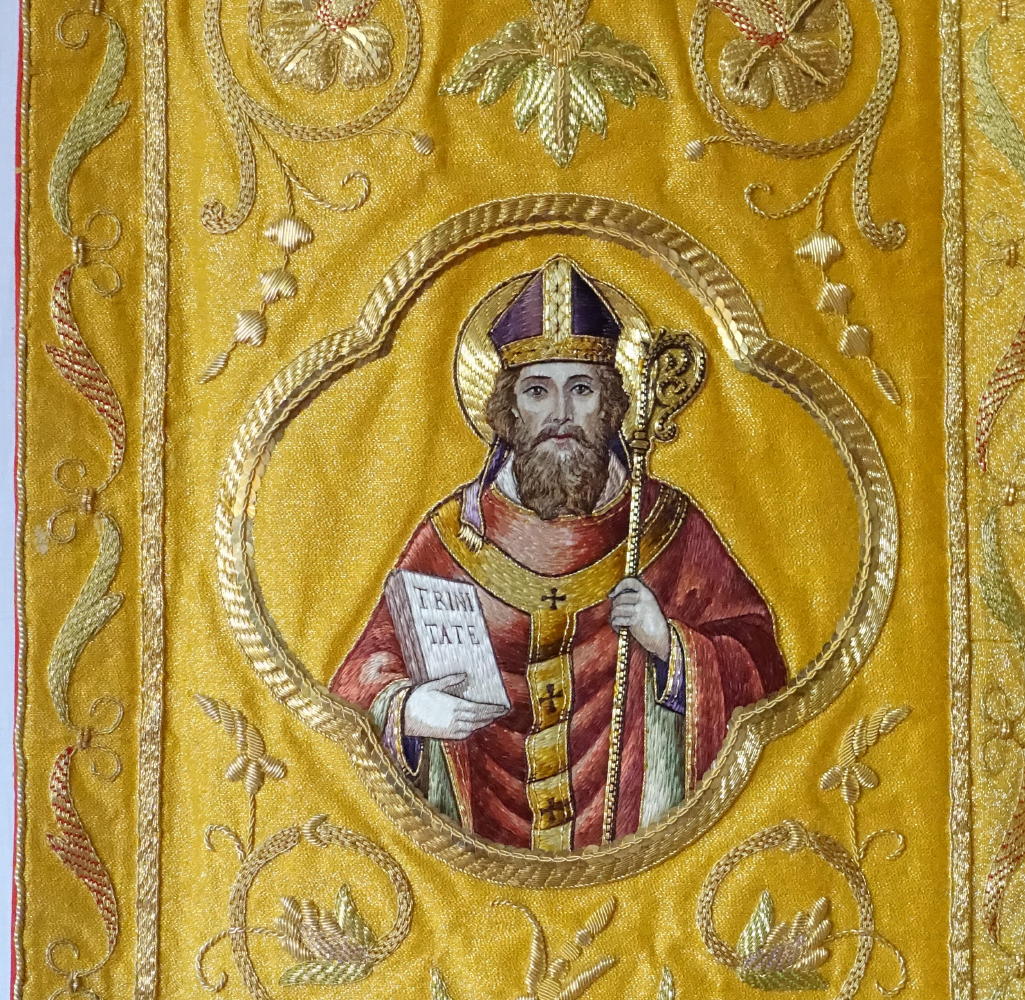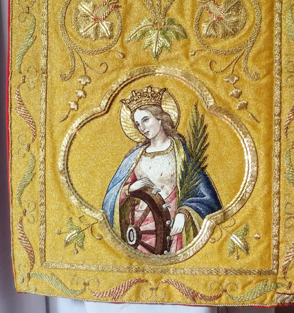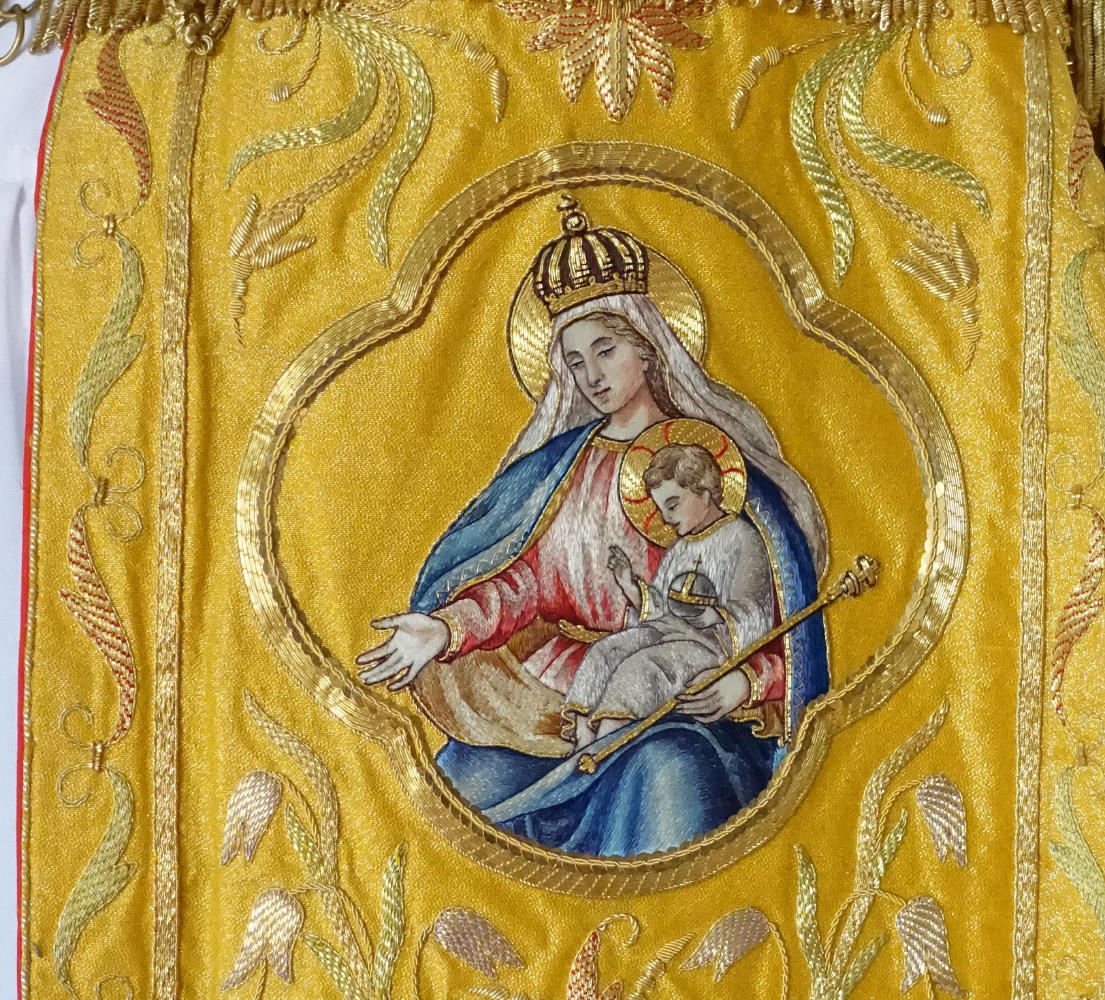 Dedicated to St Peter & St Paul, the Cope and Stole have rich gold bullion embroidery, finished with coloured silk embroidered pictures of St Peter & St Paul.