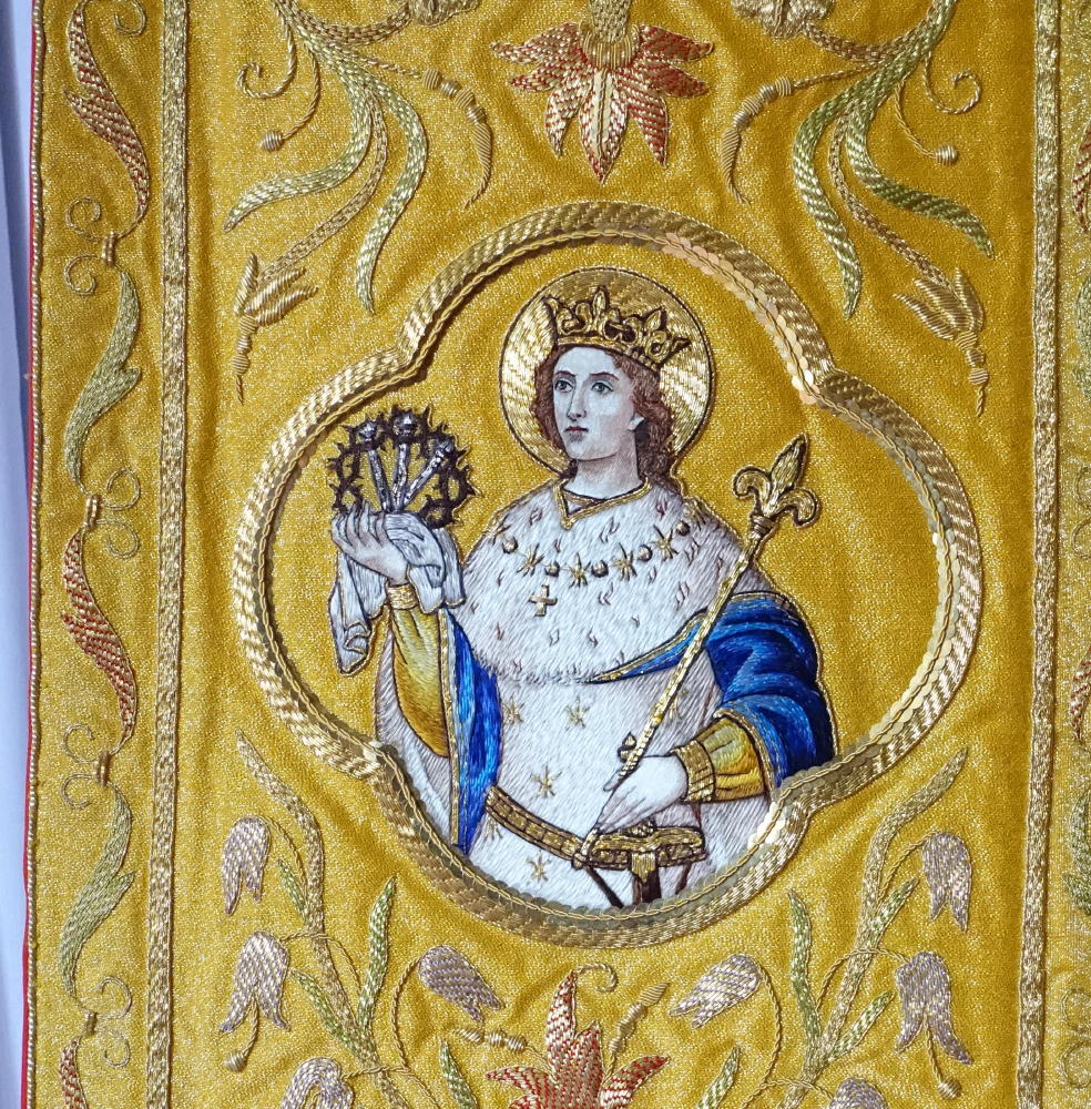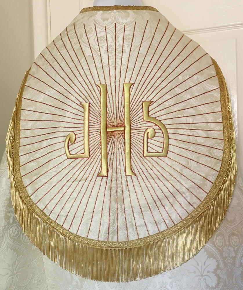 Hood and Panels worked with bold gold embroidered design, incorporating Crosses to the panels and large IHS with rays covering the hood.