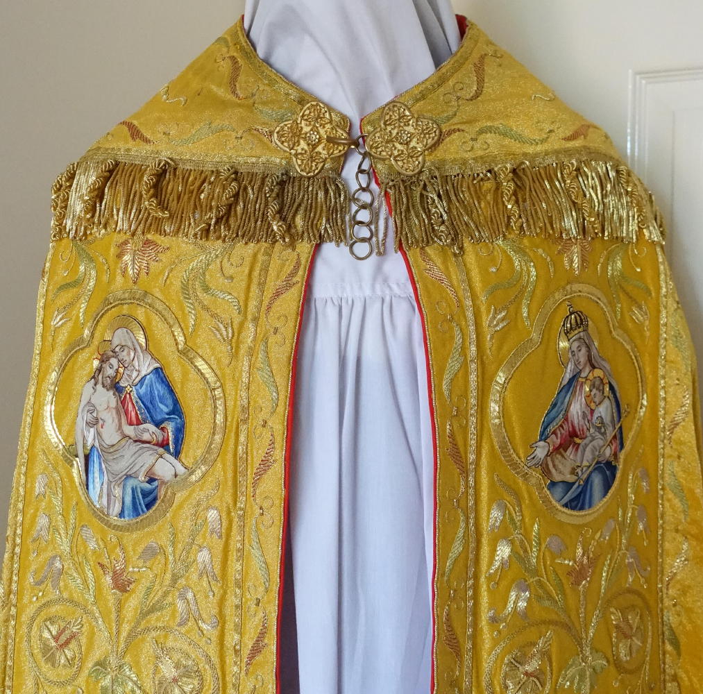 Panels & hood heavily embroidered in very rich, ornate, gold bullion embroidery throughout, with gold bullion braid finishing and gold fringe to the Cope hood.