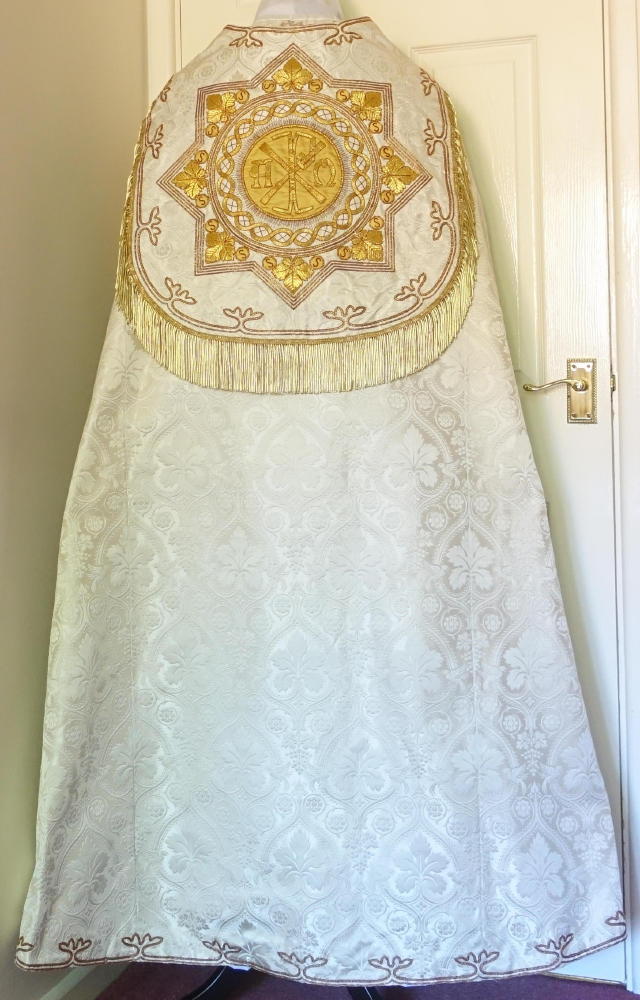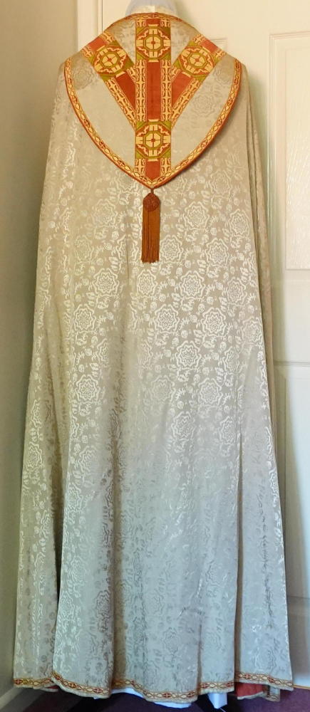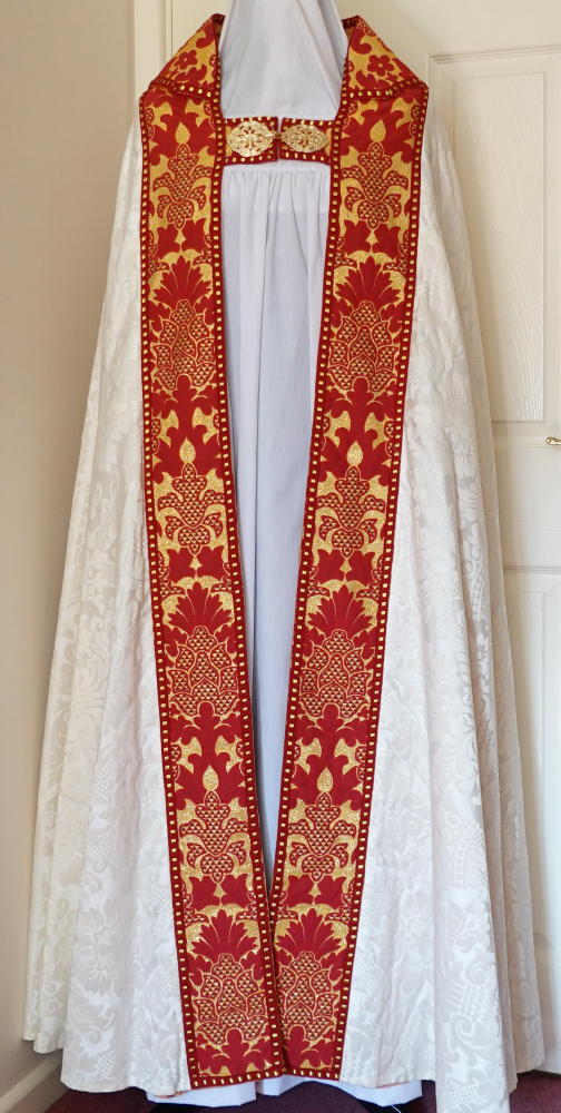 Ref 8813. White Gothic Cope made by Louis Grosse. Made in ivory damask with braid orphreys & finish to hood.