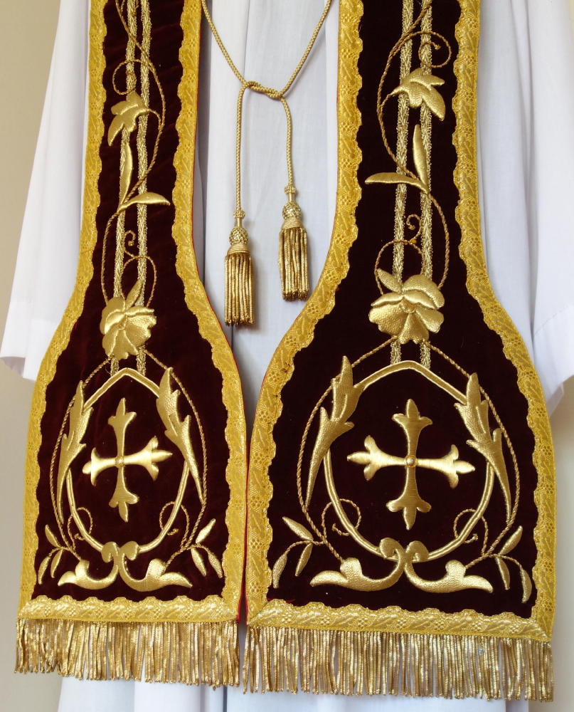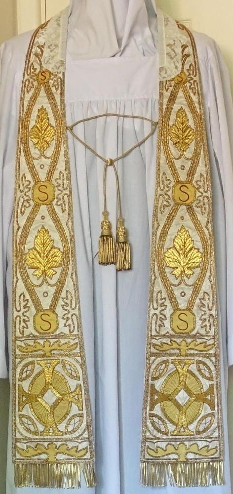 Complete with matching Stole, embroidered to the same designs, with gold bullion tassels at the centre.