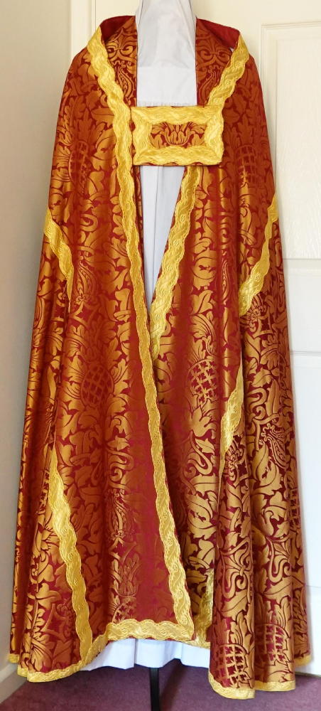 Ref 8918. Red Roman style Cope in red/gold Fairfod brocade, finished with gold bullion wavy braid.