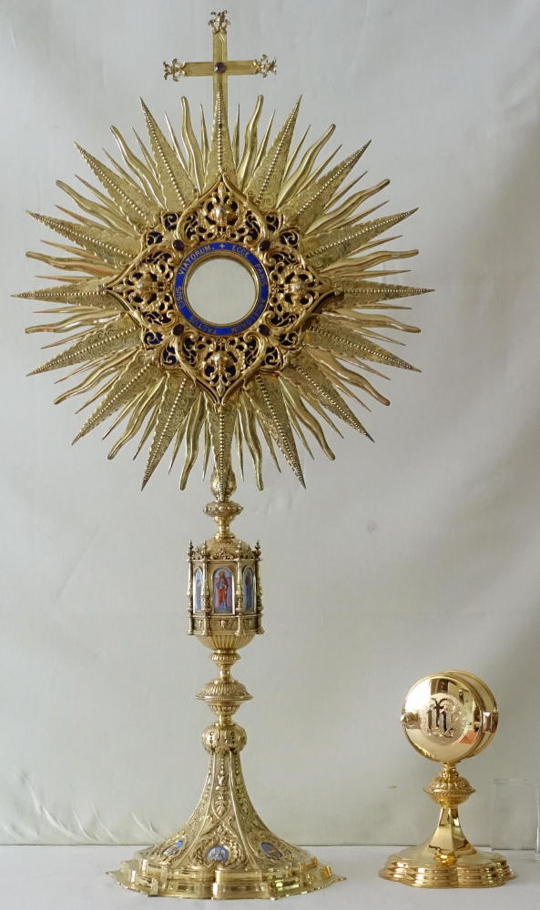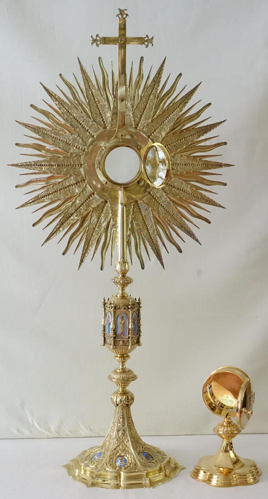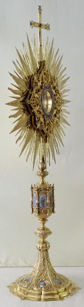 This is a large, ornate Monstrance in sunburst style, finished with fine enamels, engraving and coloured stones.