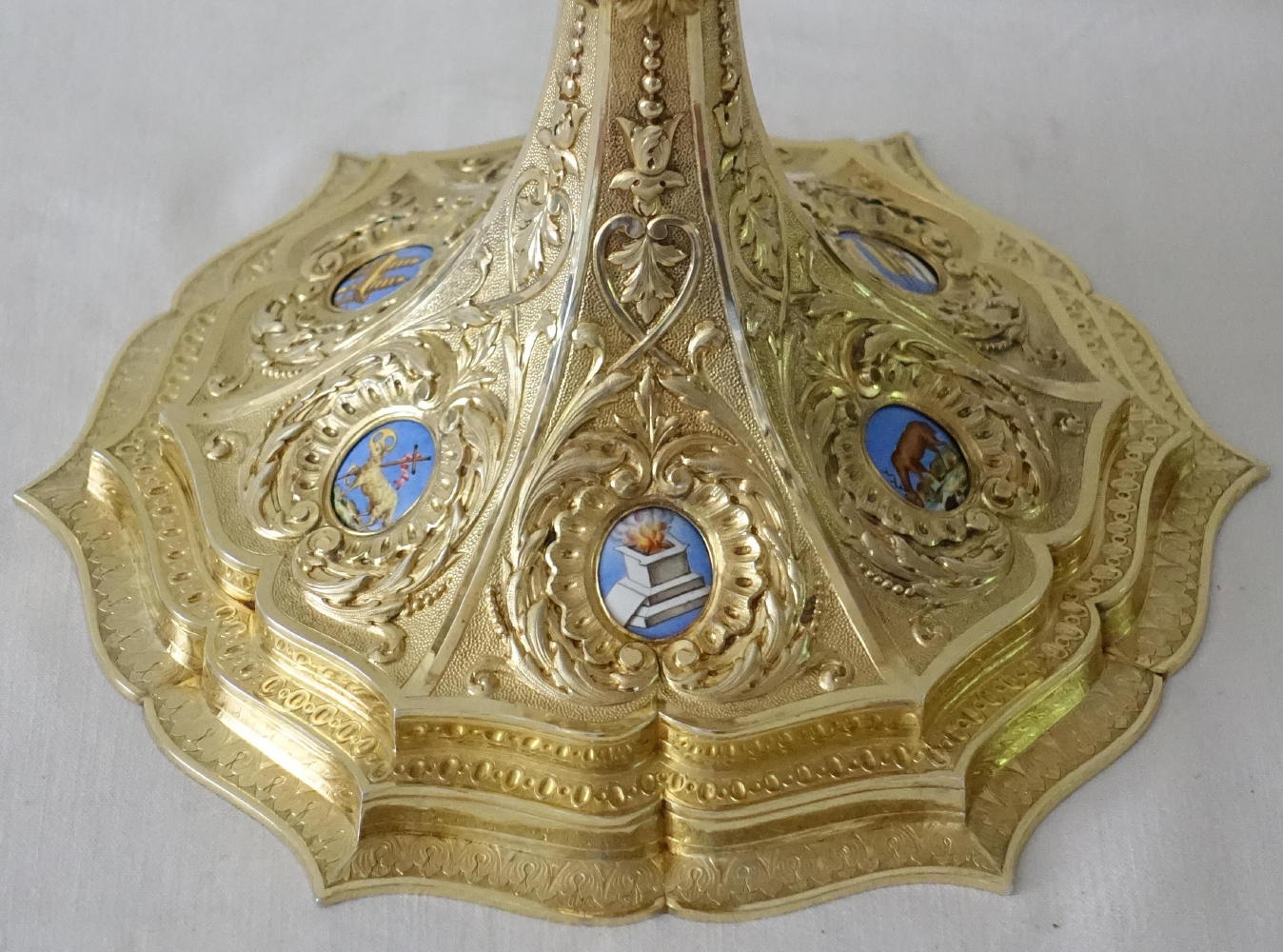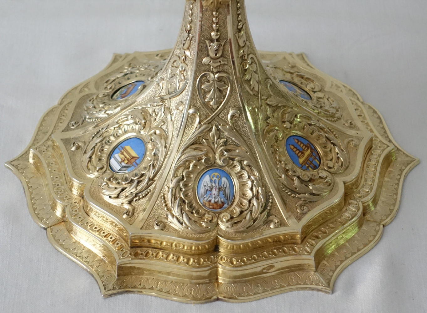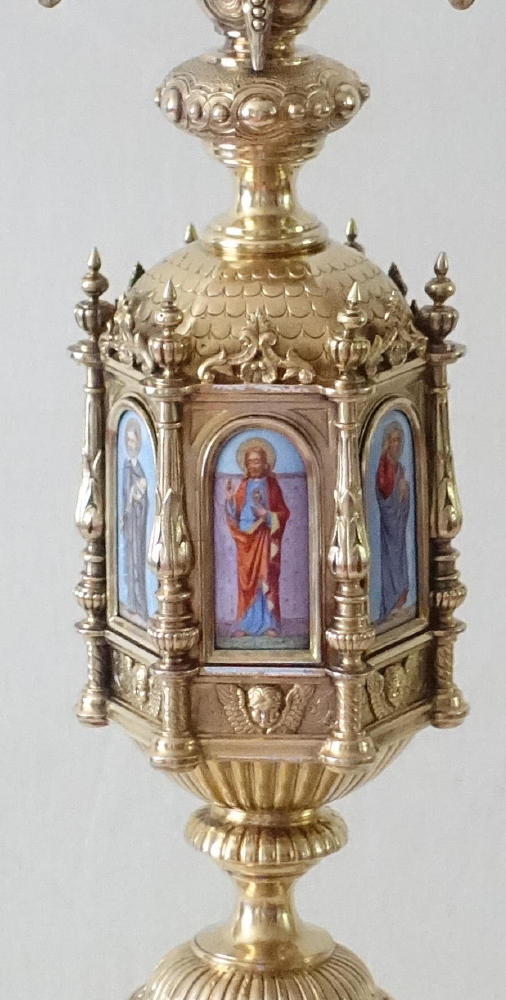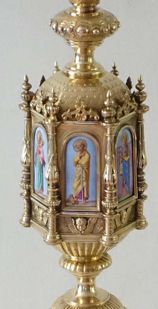 The circular stem leads to the large central hexagonal knop, set with pillared arches, each with a large coloured arched enamel. These depict The Sacred Heart of Jesus, St Peter, St Joseph and Child, St Paul, The Immaculate Heart of Mary, St Vincent de Paul.