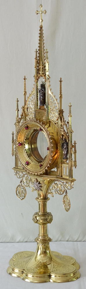 The Monstrance was made by Alois Kreiten who worked in Cologne, Germany from 1888 onwards. It is made in brass gilt.