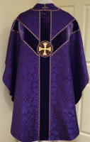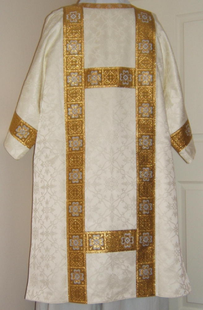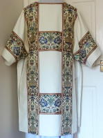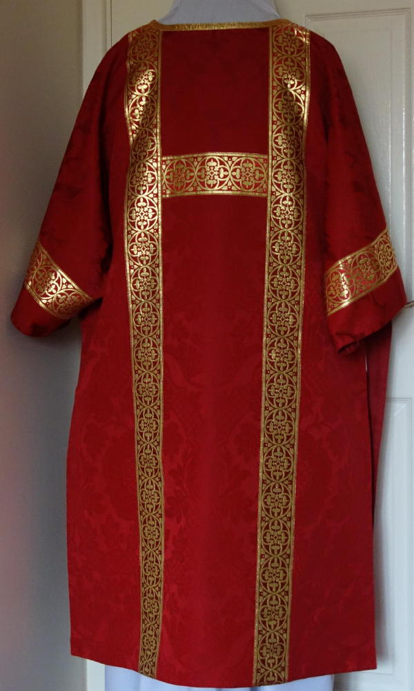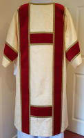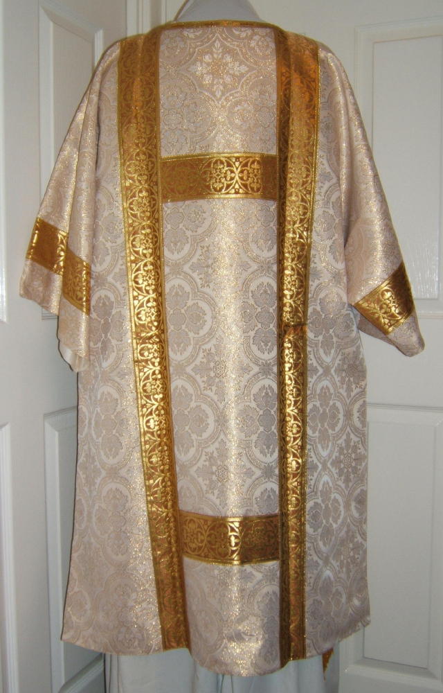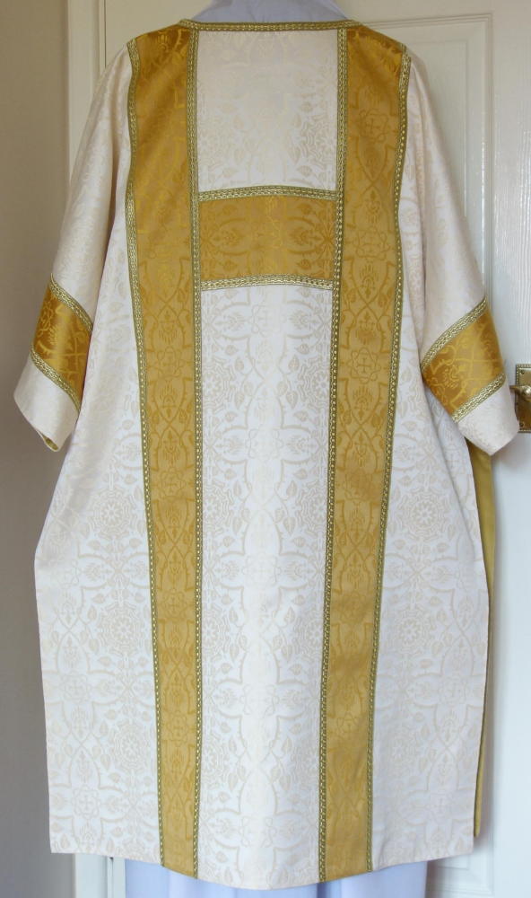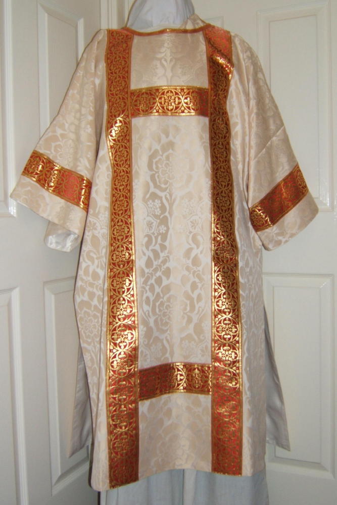 Basic set comprises Gothic style Chasuble, 2 Dalmatics, 2 Stoles, Chalice Veil & Burse. Cope, Humeral Veil & Maniples may also be made on request
