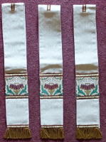 Orphreys on the Chasuble & Dalmatics chosen from a range of orphrey braids and fabrics. A selection of braids & fringe also available for finishing all pieces.