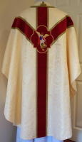 Ref GH003-W10. Complete top quality High Mass Set in ivory silk with rich red/gold brocade orphreys.