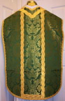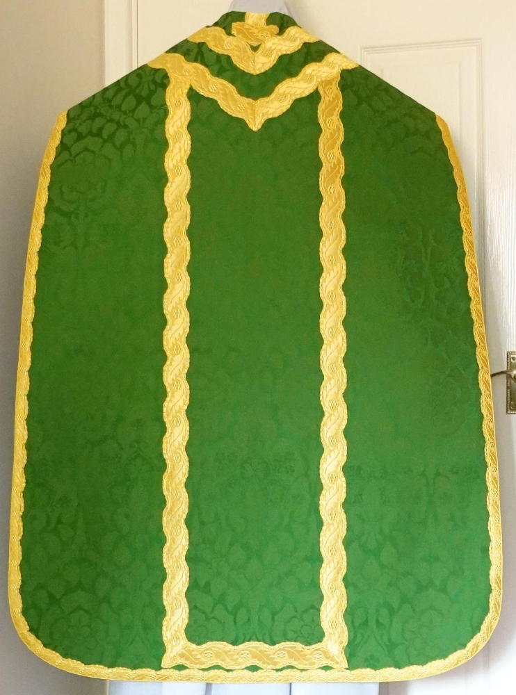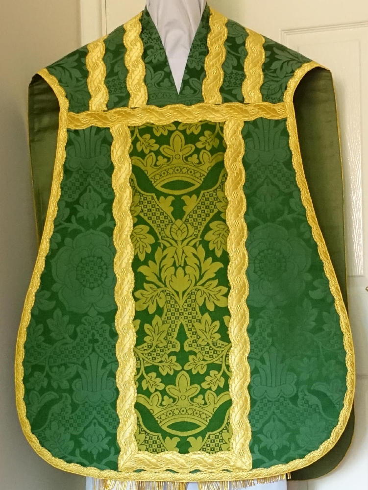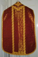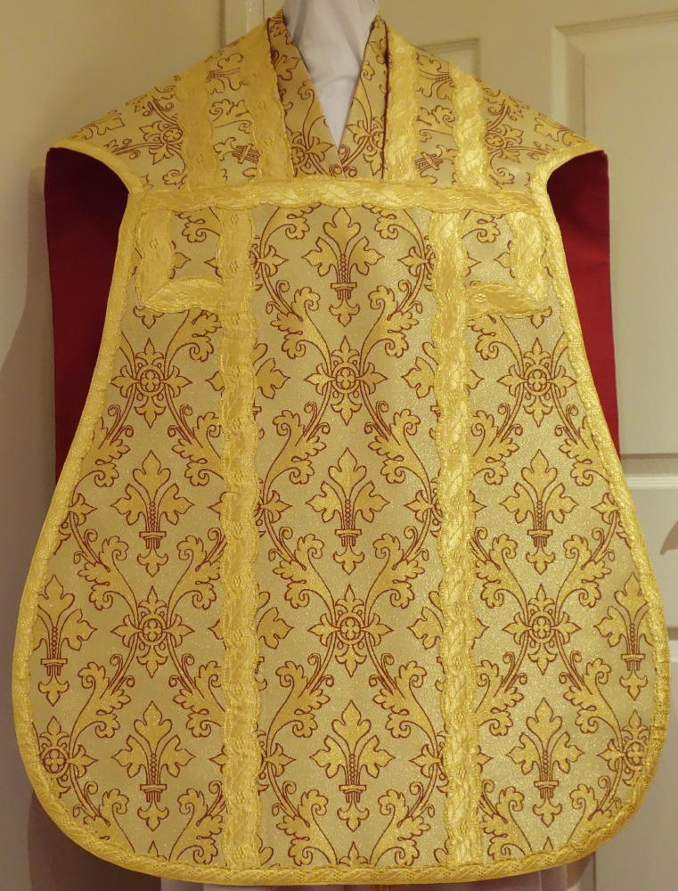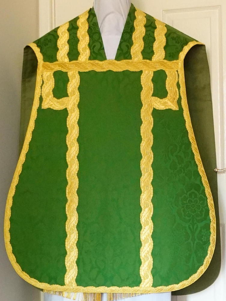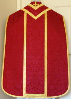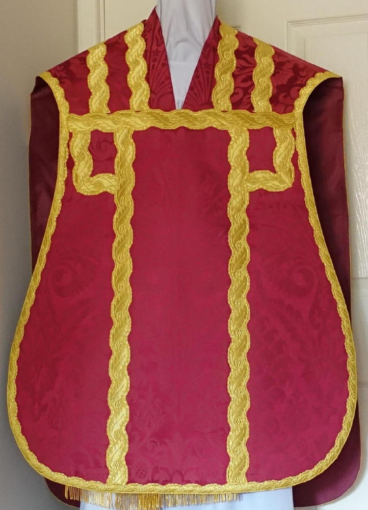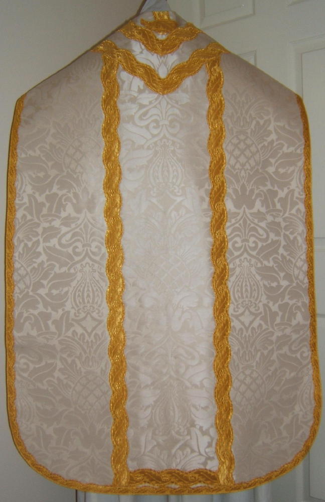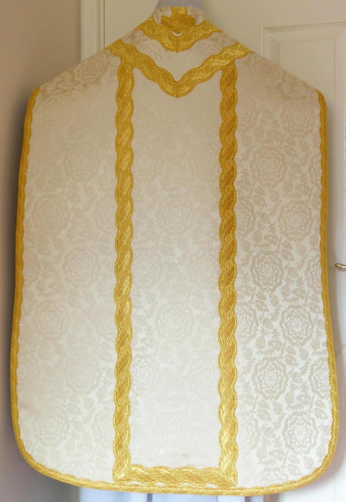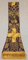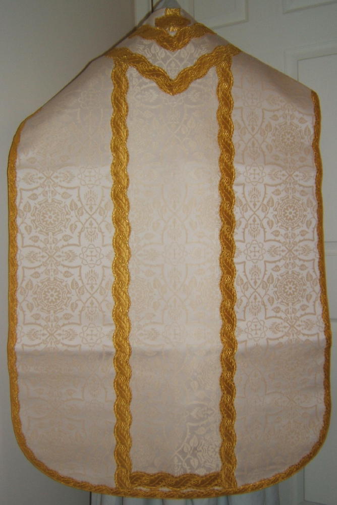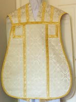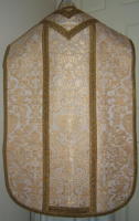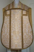 Orphreys outlined in wide gold or silver bullion wavy or straight braid & Chasuble edged with narrow gold/silver bullion wavy or straight braid. Pieces finished with gold/silver bullion braid & fringe as appropriate.