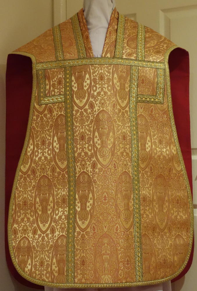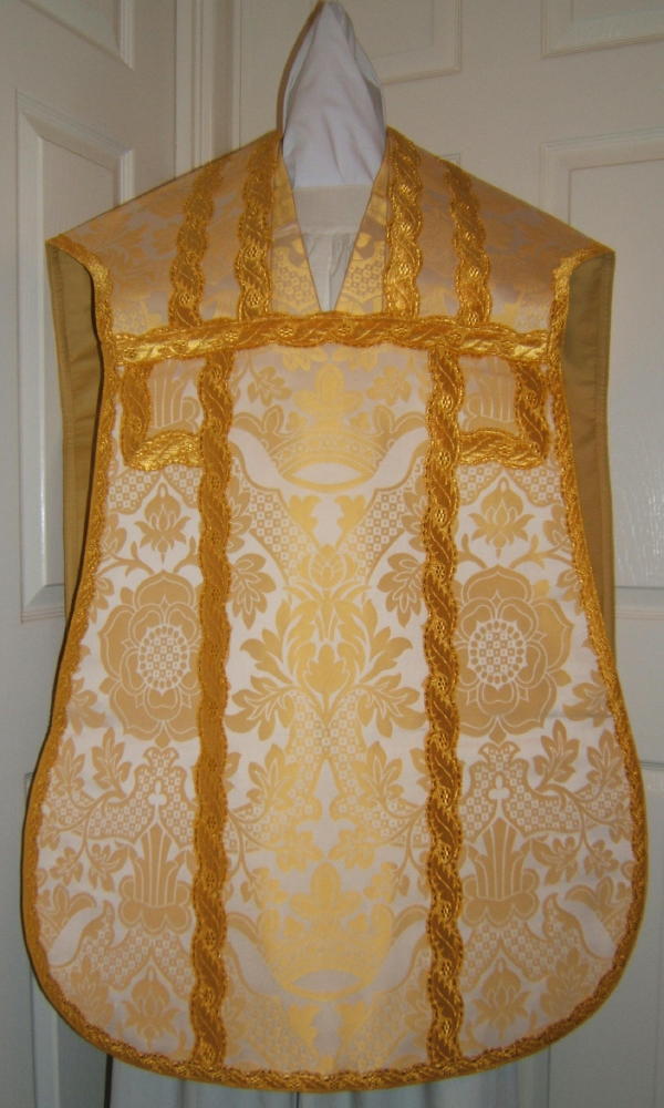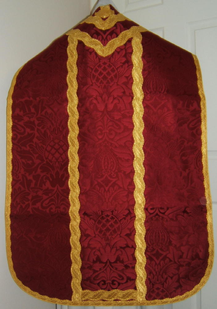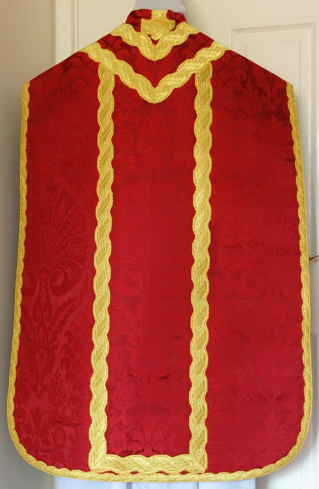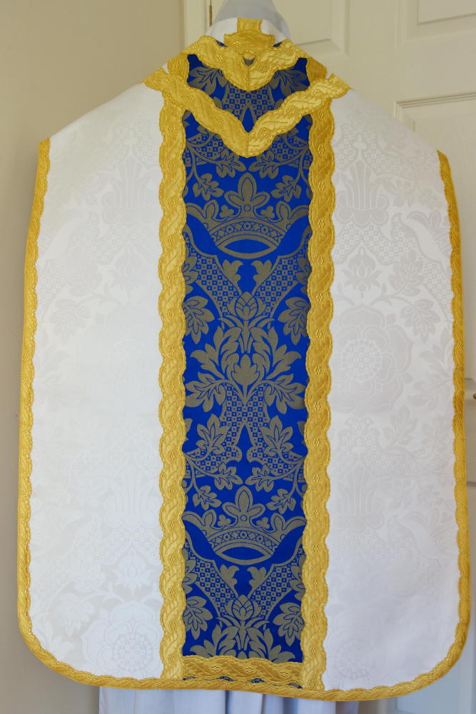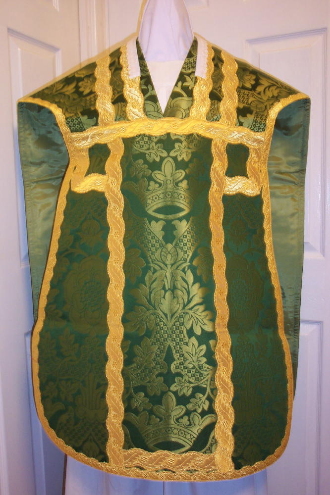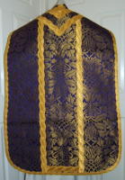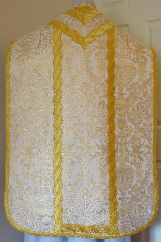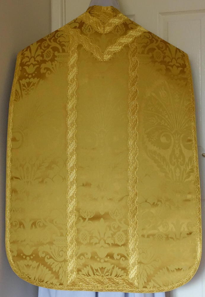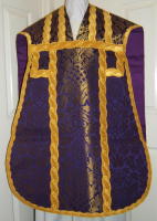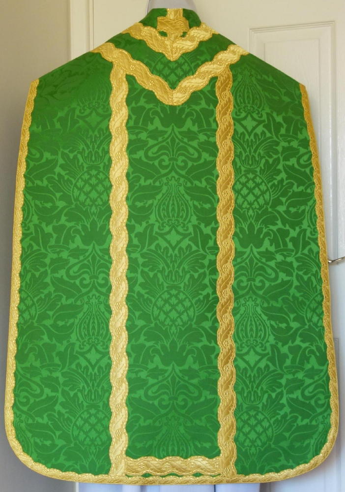 Orphreys outlined in wide gold or silver bullion wavy or straight braid & Chasuble edged with narrow gold/silver bullion wavy or straight braid. Pieces finished with gold/silver bullion braid & fringe as appropriate.