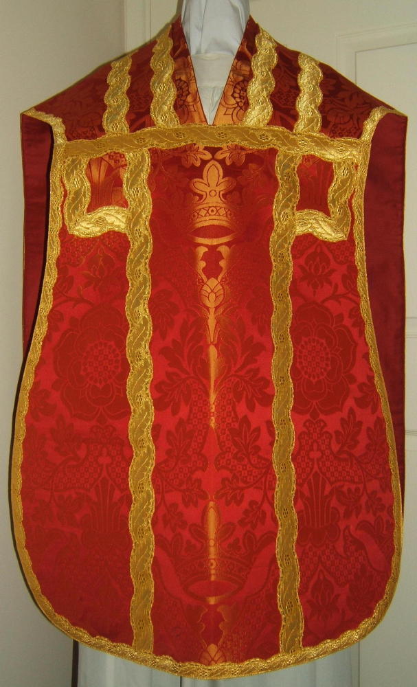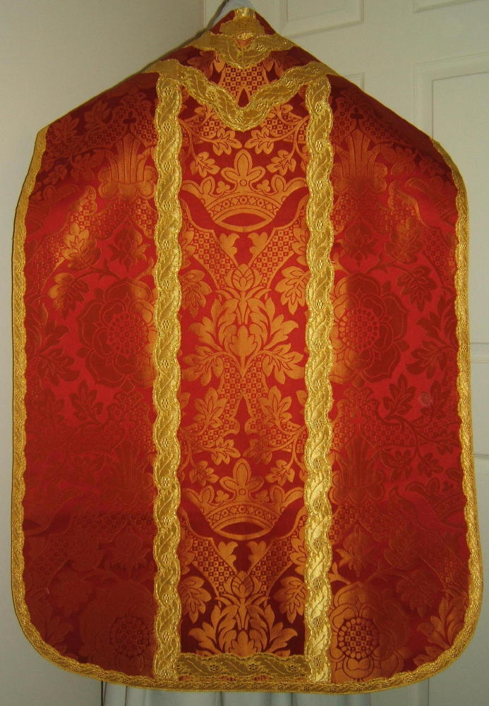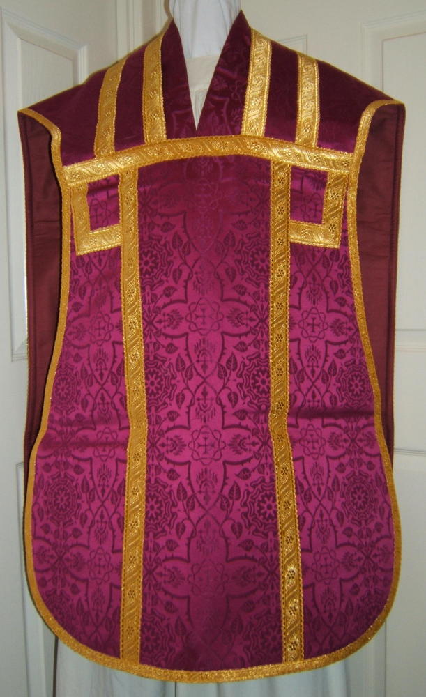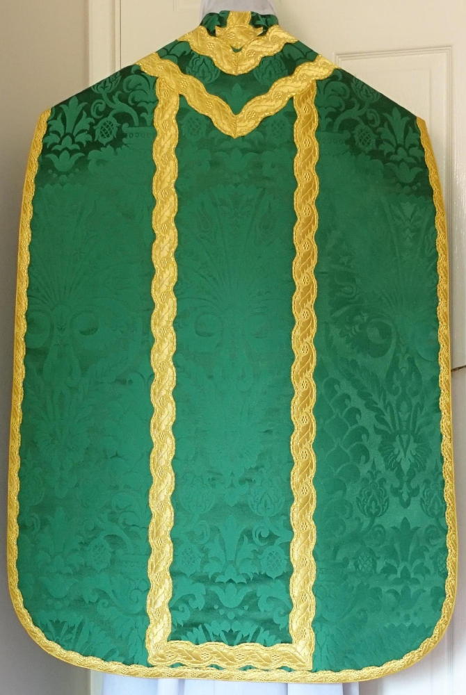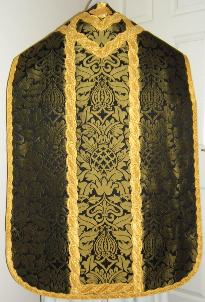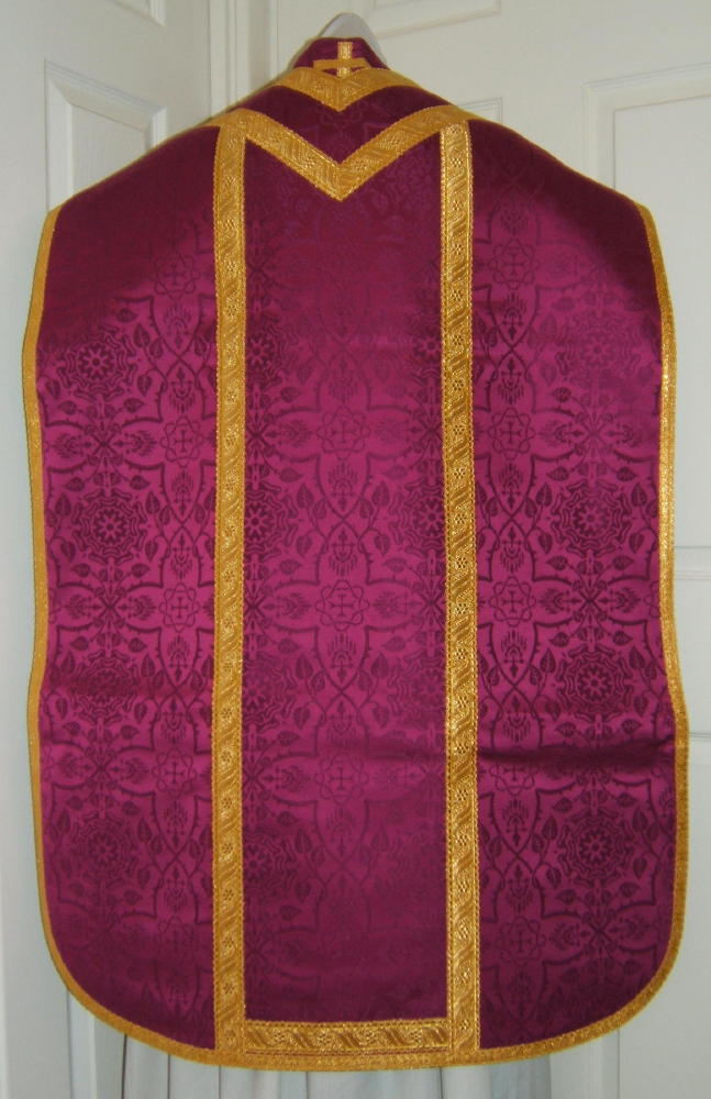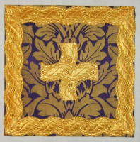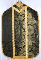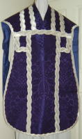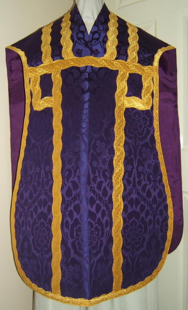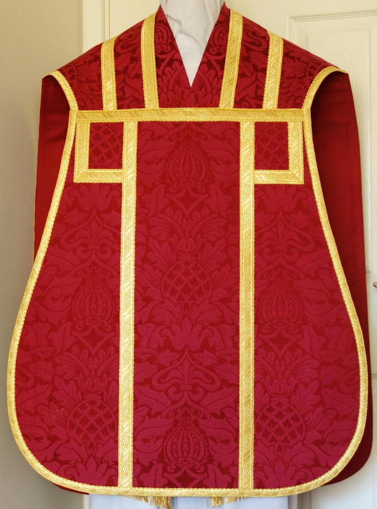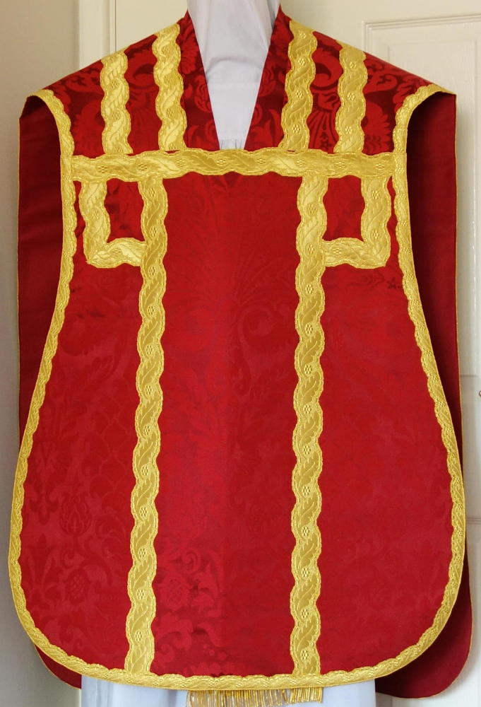 Orphreys outlined in wide gold or silver bullion wavy or straight braid & Chasuble edged with narrow gold/silver bullion wavy or straight braid. Pieces finished with gold/silver bullion braid & fringe as appropriate.