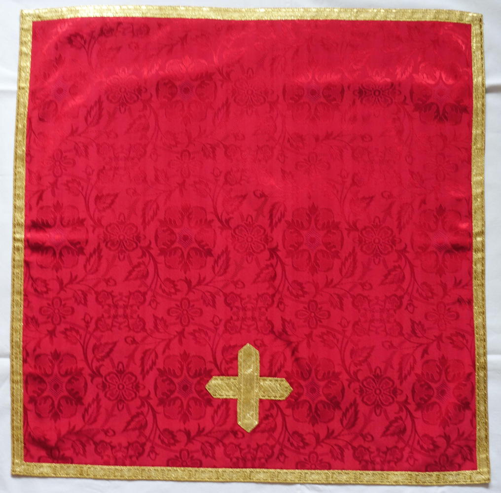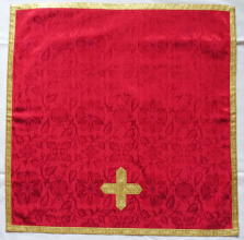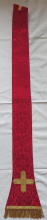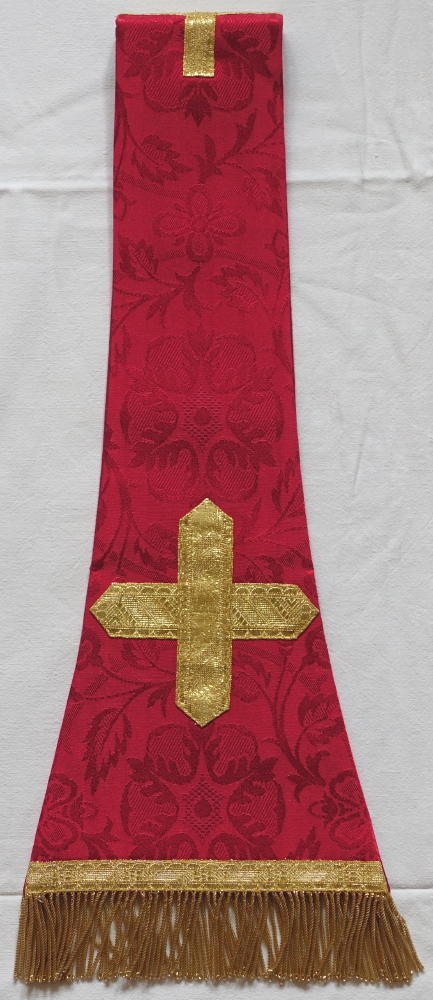 Orphreys outlined in straight gold braid & Chasuble edged with gold braid. Pieces finished with gold braid & gold bullion fringe.