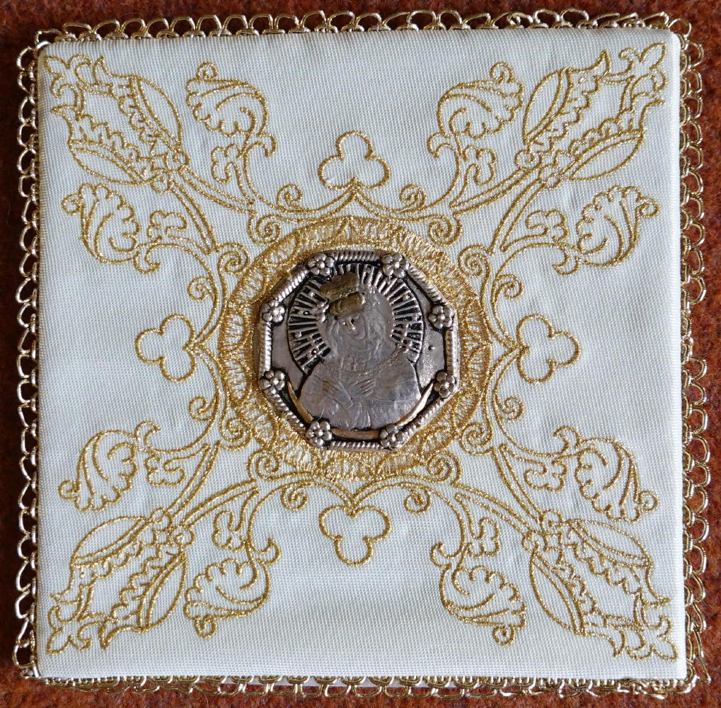 Machine embroidered Palls in white, various designs, finished with metal medallions dedicated to various Saints or Religious Symbols. Size 17cm square.