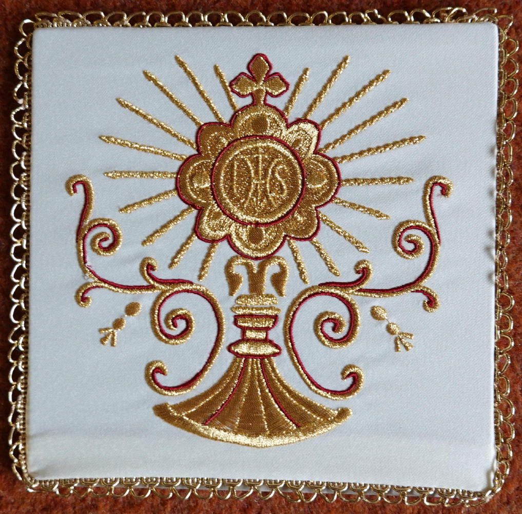 High quality machine embroidered Palls in various designs & colours, 17cm square, edged in narrow gold lace. All the Palls illustrated below are currently in stock unless stated otherwise.