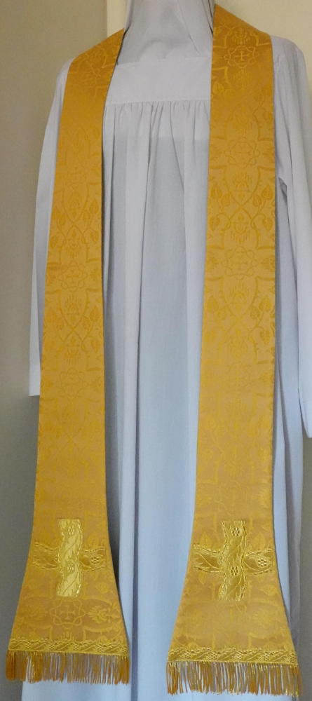 Made in quality damask, finished with gold or silver bullion braid, in a variety of fabrics. Finished with gold or silver bullion fringe. Some Stoles will usually be in stock, and samples are illustrated below. Please do ask if you have specific requirements not shown here.