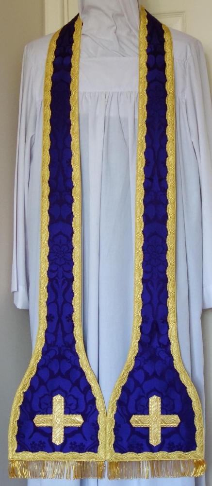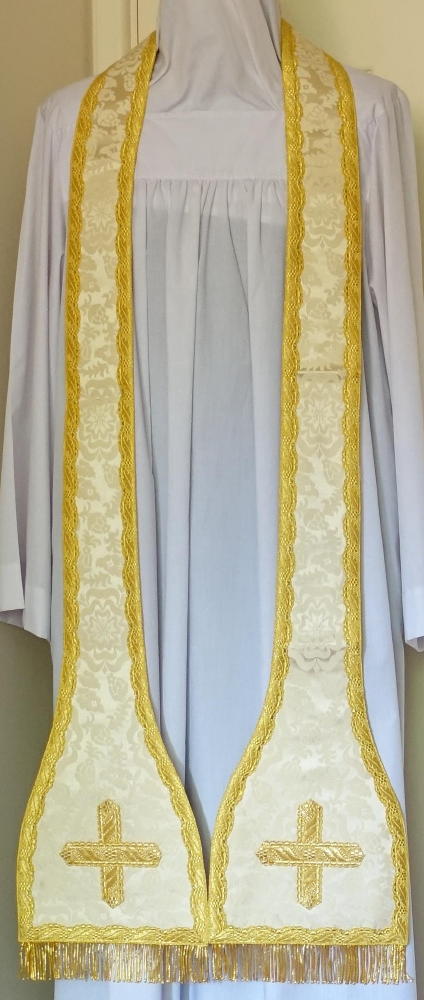 Made in quality damask, finished with gold or silver bullion braid, in a variety of fabrics. Finished with gold or silver bullion fringe. Some samples illustrated below. These Stoles are available to order in any liturgical colour. Please do ask if you have specific requirements not illustrated.