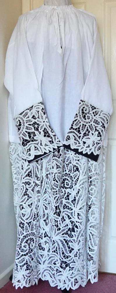 Early 20th century Albs with lace to base & cuffs; linen tops with narrow lace finish & cord toggle fastenings; black backing to lace at cuffs and bases.