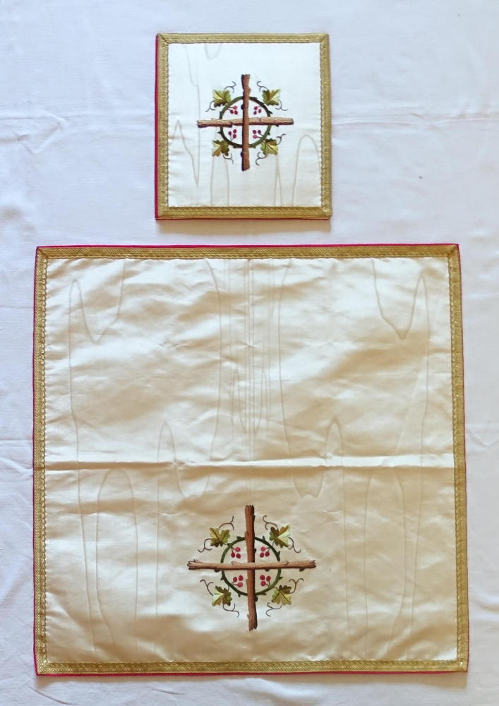 5 pieces, all finished with embroidery: Chasuble, Stole, Maniple, Chalice Veil & Burse. Price £3,500. (US$4,900)