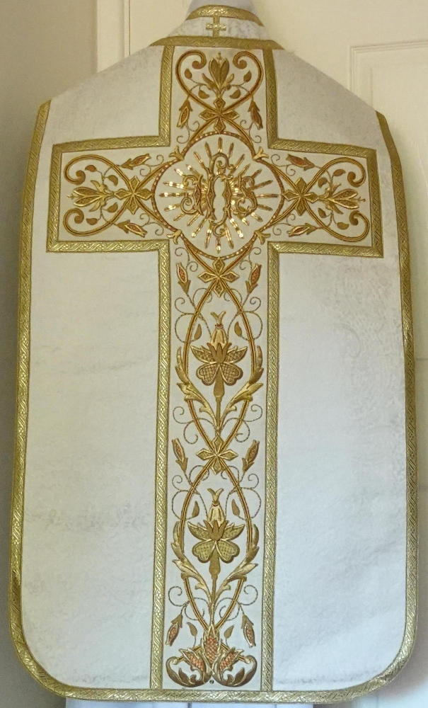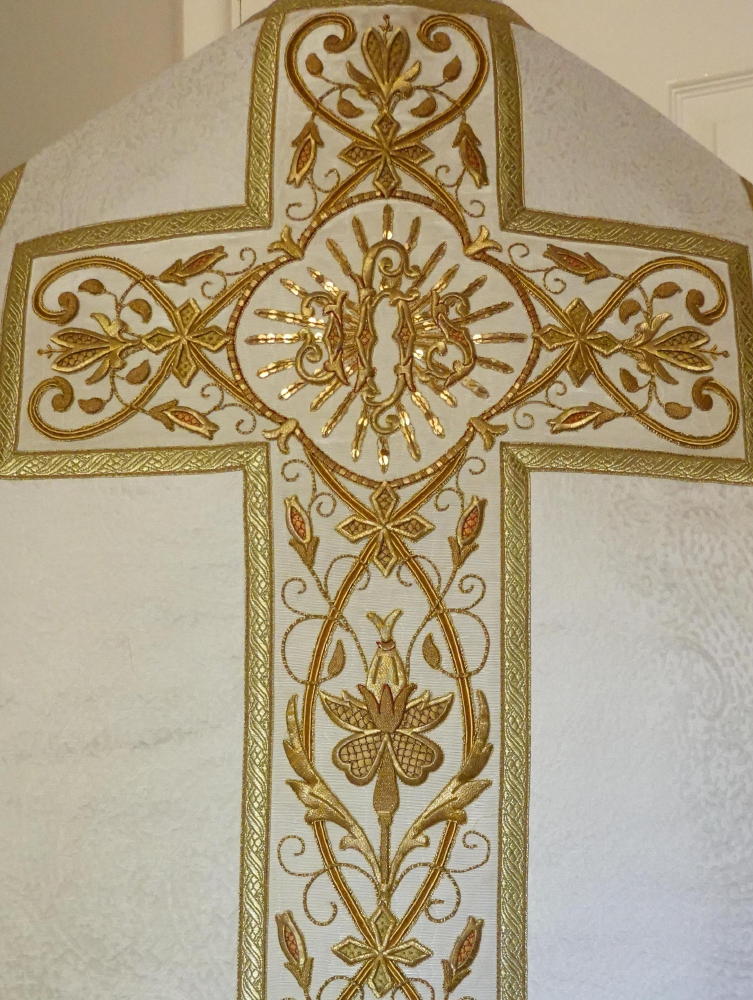 Orphreys on ribbed ivory silk worked in gold bullion embroidery throughout with central sunburst IHS to back.